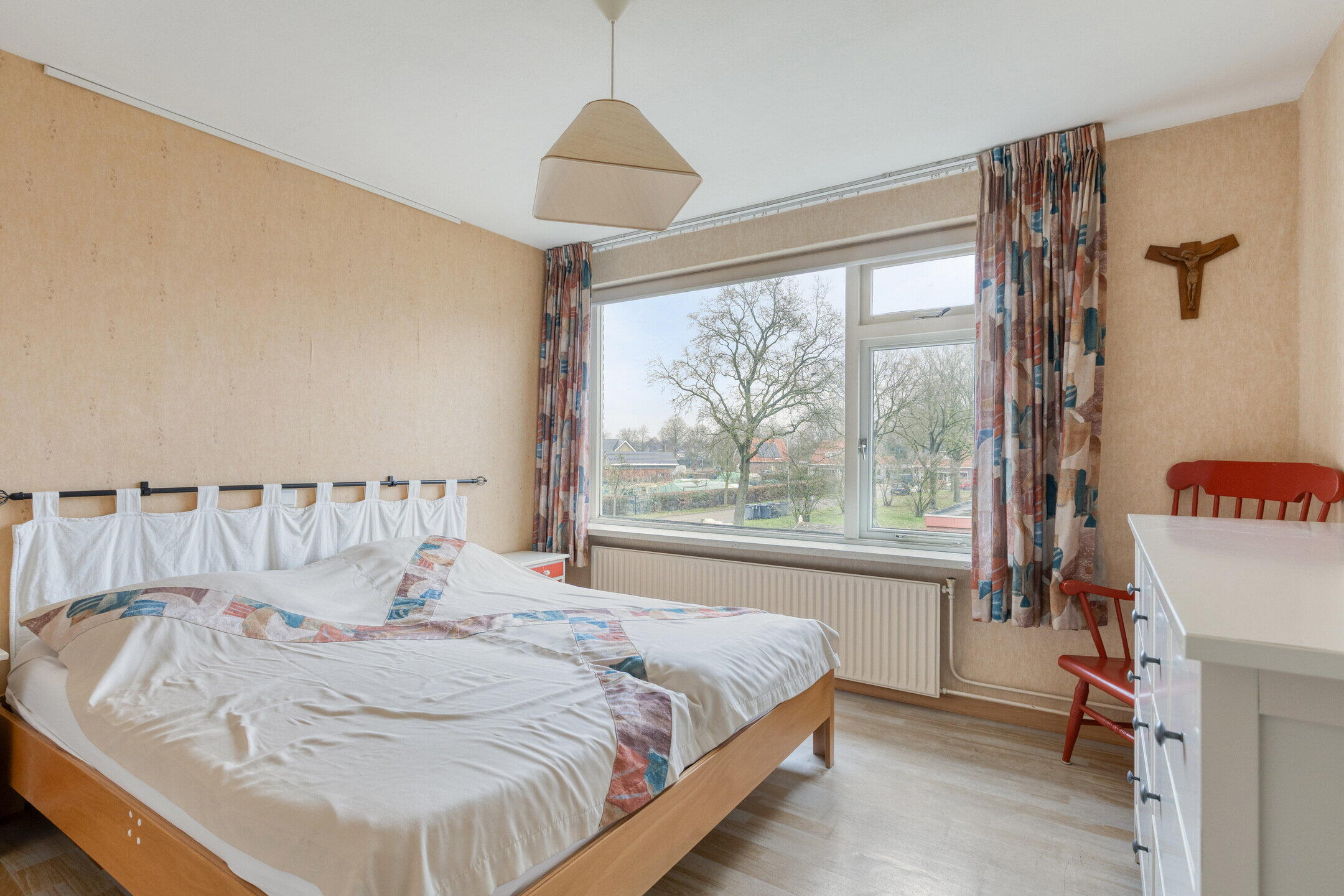 Op de eerste verdieping bevinden zich drie slaapkamers. Alle kamers beschikken over grote raampartijen, kenmerkend voor deze bouwperiode. De master bedroom is voorzien van vaste inbouwkasten, wat praktisch en ruimtebesparend is. Vanuit deze kamer is tevens de bergruimte boven de uitbouw bereikbaar. De tussentijds gemoderniseerde badkamer biedt comfort in de vorm van een royale inloopdouche, toilet, wastafel en elektrische vloerverwarming. Daarnaast zijn er een groot ventilatieraam en een designradiator aanwezig.